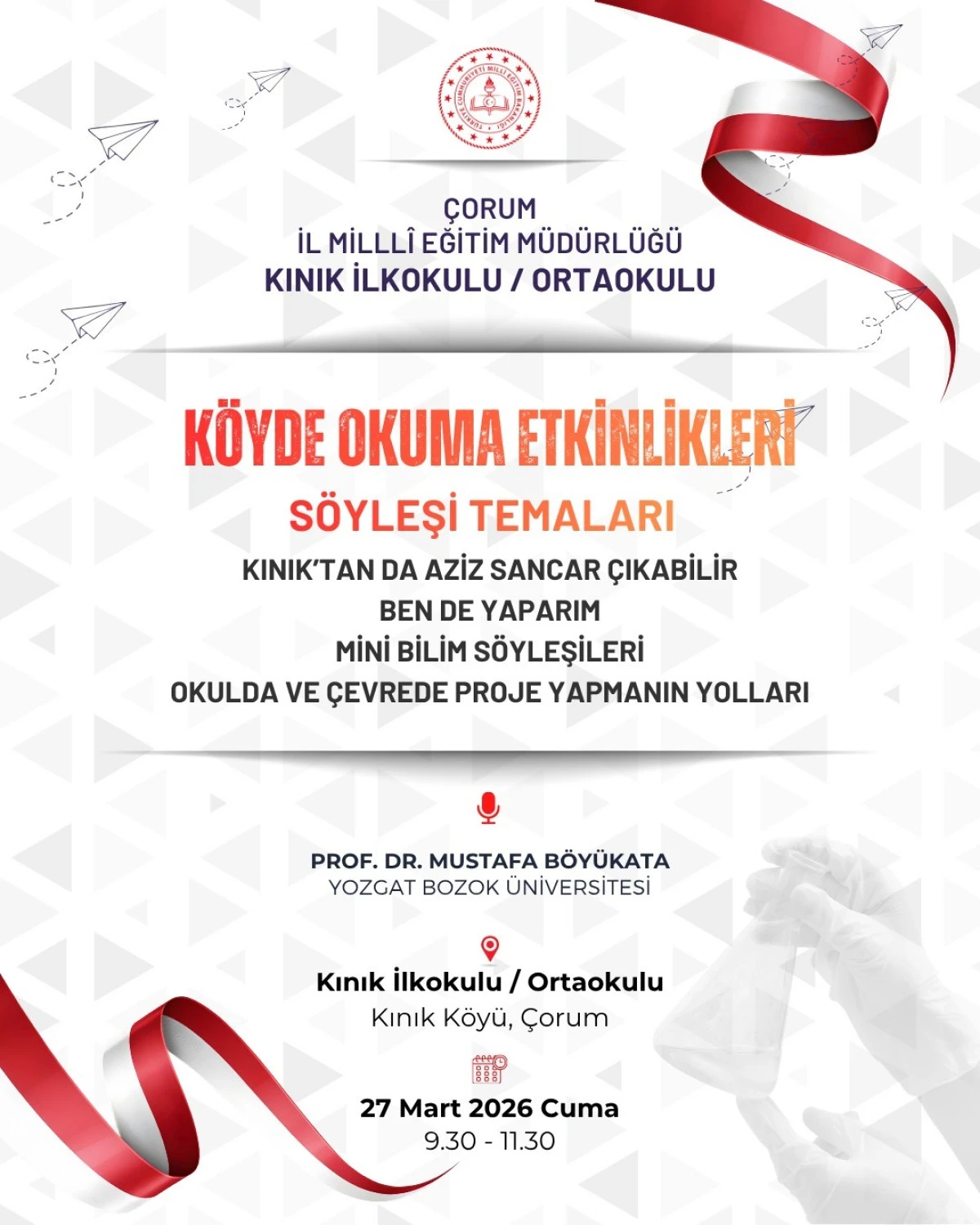 Çorum İl Milli Eğitim Müdürü Cemil Çağlar’ın daveti üzerine, Yozgat Bozok Üniversitesi (YOBÜ) öğretim üyesi Prof. Dr. Mustafa Böyükata 27 Mart 2026 Cuma günü peş peşe ziyaret ettiği Kınık İlkokulu / Ortaokulu ve Bozboğa İlkokulu’nda “Köyde Okuma Etkinlikleri” ismiyle tanınan etkinliklerin 90 ve 91’incisini gerçekleştirdi. Etkinliklerde Çorum İl Milli Eğitim Müdürlüğü Şube Müdürü Arslan Arslan da yer aldı.