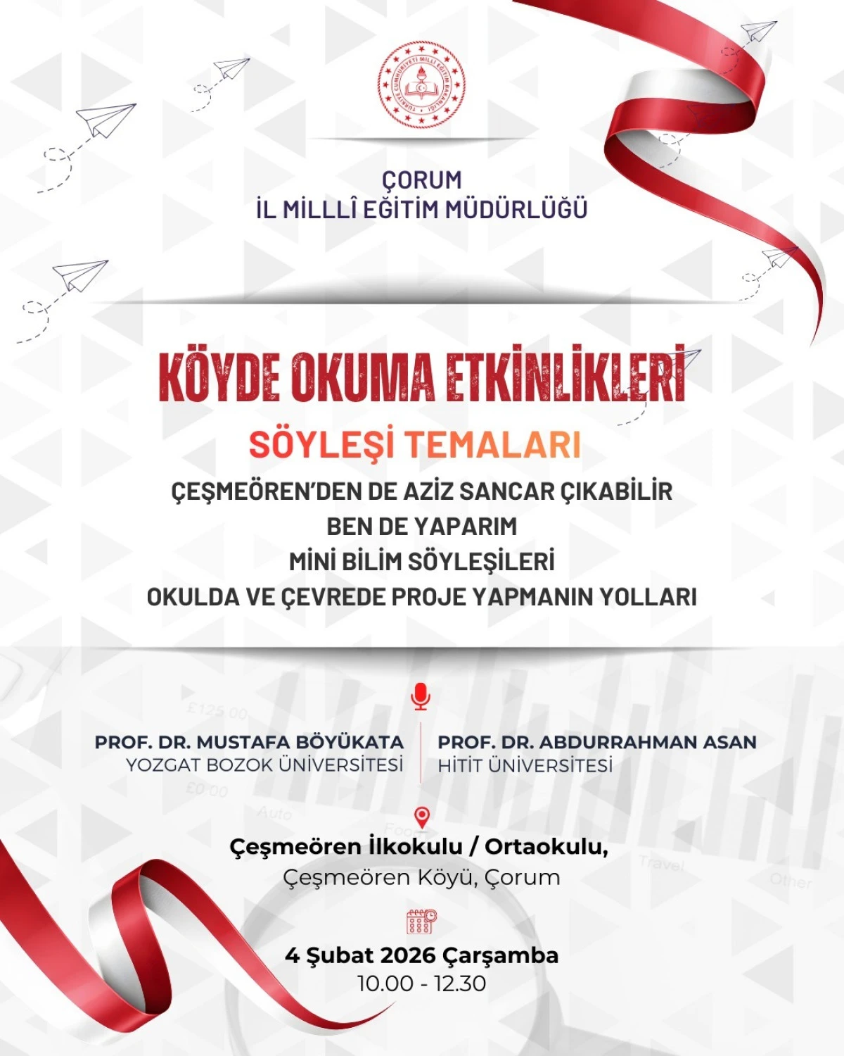 Çorum İl Milli Eğitim Müdürlüğünün daveti üzerine 4 Şubat 2026 Çarşamba günü Çeşmeören İlkokulu / Ortaokulu öğrencileriyle bir araya gelen akademisyenler, çocuklarla kısa kısa söyleşiler yapıp bilgiler paylaştı, meraklarını uyandırdı ve onların sorularına cevap verdiler.